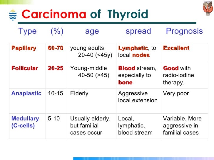 Most of these cancers are so aggressively attached to vital neck structures that they are inoperable at the time of diagnosis. However, some papillary thyroid cancer variants have been shown to be more aggressive, showing higher rates of spread to both lymph nodes and outside of the neck as well as having increased rates of cancer recurrence and decreased survival. Its very rare: The American Thyroid Association notes that this type represents less than percent of all cases of. Thyroid Cancer Stages: What You Need To Know Papillary or Follicular Thyroid Cancer - Patients Age and Older Stage I - You only have cancer in your thyroid.