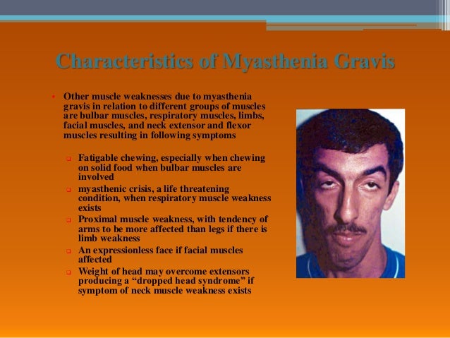 Myasthenia Gravis: Symptoms of Myasthenia Gravis Aug 1 20Many of those suffering from myasthenia gravis complain of arm and leg weakness. This operation to remove the thymus gland (which often is abnormal in individuals with myasthenia gravis) can reduce symptoms. Myasthenia Gravis: Symptoms, Signs, Causes Treatment Myasthenia gravis is an autoimmune disease affecting nerve and muscle signaling. It is understandable why, as the muscles of the upper and lower extremities are commonly affected as. This can cause: difficulty holding the head up difficulty with physical tasks, such.