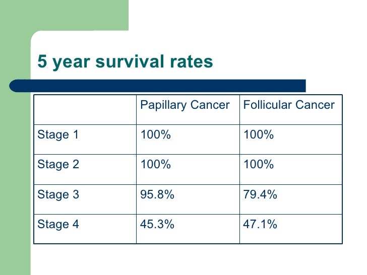 Jun 1 20Medullary Thyroid Cancer: Prognosis, Life Expectancy, and Survival Rate Medically reviewed by George T. As a rule, the lower the number, the less the cancer has spread. The survival rate of the first and second stages is between to 80. A higher number, such as stage IV, means cancer has spread more. It is very common in men and women who are above years old.